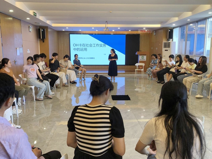 为提升社区工作者整体工作效能,挖掘个体潜能,共同探索团队的力量,增强团队凝聚力,习得心灵探索技巧调解居民及自身压力,同时丰富社区工作者心理健康知识,2023年9月11日下午,深圳市东西方社工服务社督导江静讲师给社会工作者开展OH卡在社会工作实务中的运用培训,讲师通过OH卡的认识、理论基础、应用原则和精神、提问技巧和方法、实际运用几个方面让大家了解OH卡。