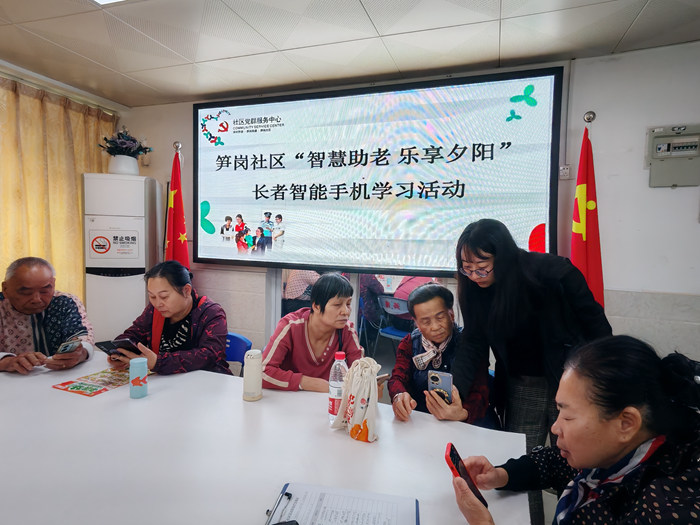 为帮助老年人跨越技术障碍、感受数字科技的实用性和趣味性、增强社会参与感,2025年2月20日上午,在笋岗社区党委的支持下,笋岗社区党群服务中心联合深圳市东西方社工服务社在笋岗社区工作站二楼开展了笋岗社区“智慧助老 乐享夕阳”长者智能手机学习活动,本次活动邀请了中国移动专业工作人员进行授课,共吸引15名社区长者参与。