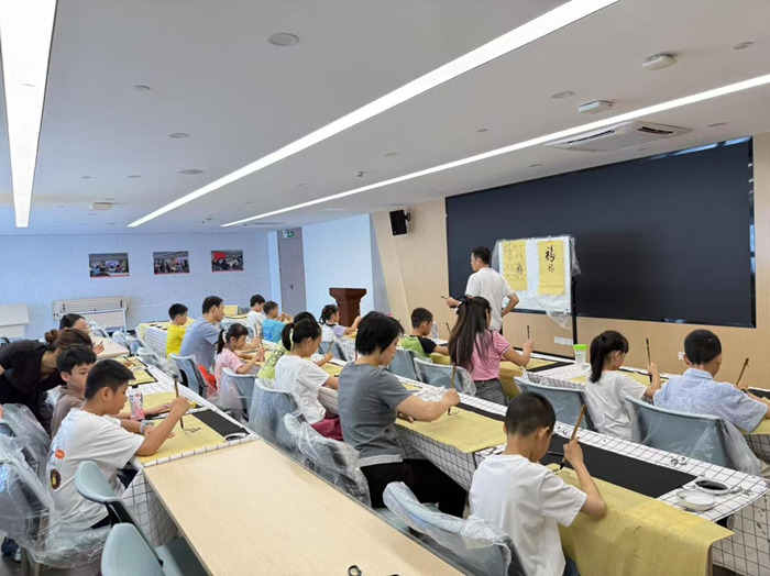 活动现场,专业书法老师老师以生动有趣的方式为亲子家庭们介绍了书法的历史渊源和文化内涵,在讲解书法基础知识时,老师深入浅出,从握笔姿势、运笔方法到笔画结构,都进行了细致入微的示范和指导。“握笔要稳,运笔要有力度,笔画要均匀……”老师一边说着,一边在宣纸上缓缓书写,那行云流水般的动作让孩子们和家长们都看得入神。
