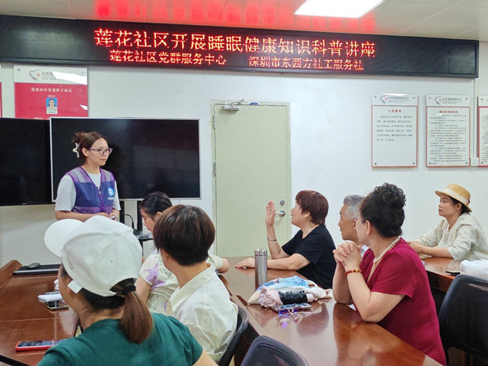 随着现代社会生活节奏的加快,睡眠问题已成为众多居民难以言说的困扰。为提升社区居民对睡眠重要性的认知,普及科学睡眠知识,助力居民掌握改善睡眠质量的有效方法,2025年6月23日上午,深圳市东西方社工服务社驻莲花社区党群服务中心社工联合莲花社区党委,携手莲花社康,共同开展了一场以“关爱睡眠 守护健康”为主题的科普讲座。
