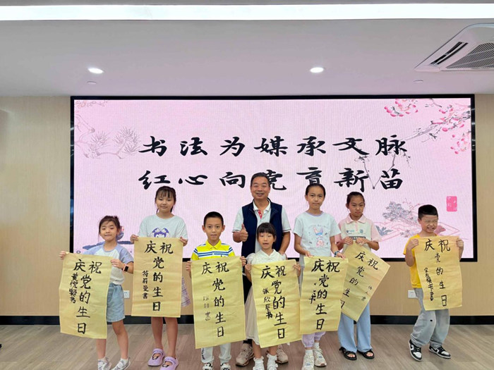 课程的核心环节,孩子们以“庆祝党的生日”为内容进行创作。稚拙的笔迹饱含真情——“庆”字的广厦之形,承载着对国泰民安的向往;“党”字的端正结构,映照着对崇高信仰的认知;“生日”二字则洋溢着纯真的祝福。一幅幅虽显青涩却真挚动人的作品,在孩子们手中诞生。十岁的学员小轩高举作品,笑容灿烂:“我要把最好的字写出来,送给党!”现场家长感慨:“孩子不仅学了写字,更懂得了感恩与传承的分量。”